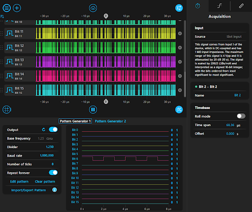 To access the Pattern Generator feature, click on the pulse symbol in the bottom right corner of the Moku Logic Analyzer, as shown in Figure 1. From here, you can change the values of the bits to program your sequence. Bits 0 through 14 control the magnitude of the output voltage (with bit 0 having the smallest effect and 14 having the largest), while bit 15 controls the sign — allowing for output voltages scaled from -5 to +5 V. For more information, check out this video explaining how to use the Pattern Generator to make sequences on Moku:Pro.