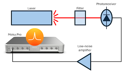RIN stands for relative intensity noise measurement, a technique that evaluates the quality of a laser by plotting the power fluctuation (relative to average output power) as a function of frequency. A Moku Spectrum Analyzer can measure the RIN in a configuration similar to the one in Figure 2. First, the laser under test emits a beam, which is usually heavily attenuated so as to not overwhelm the detector. The photoreceiver emits a voltage proportional to the input laser power. To ensure the signal power exceeds the noise floor of the spectrum analyzer, the photoreceiver current is first passed through a low-noise amplifier. The Spectrum Analyzer performs a power spectral density (PSD) measurement, which measures the distribution of laser power across frequency components. After collection, the signal can be normalized by the average laser power to obtain the RIN data.