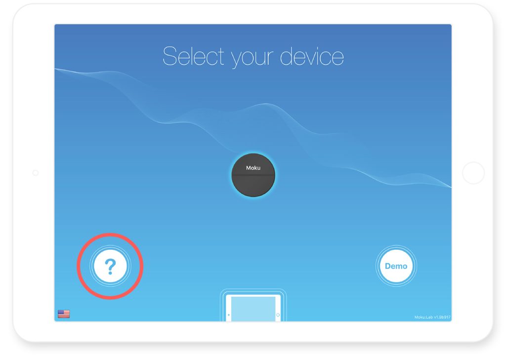 - Launch the iPad app and tap the question mark icon on the bottom left corner. Please note that this icon is only accessible when no Moku:Lab device is selected on the main screen.