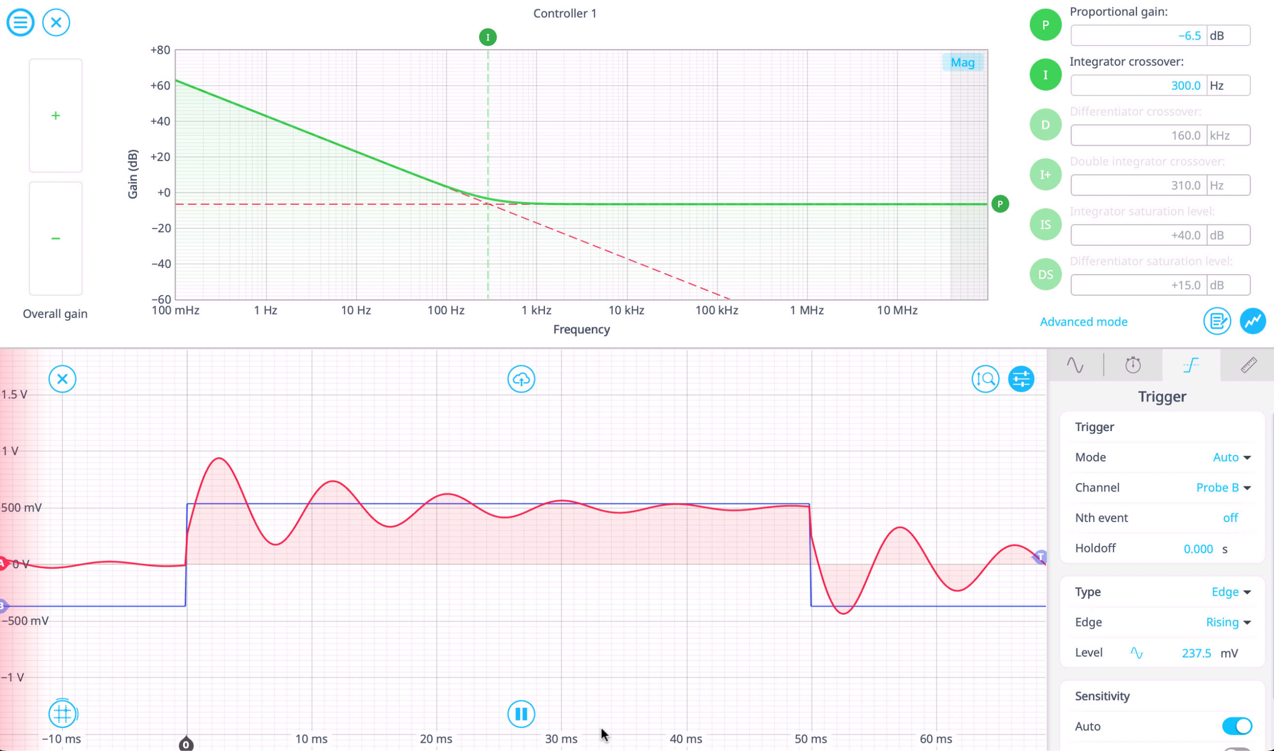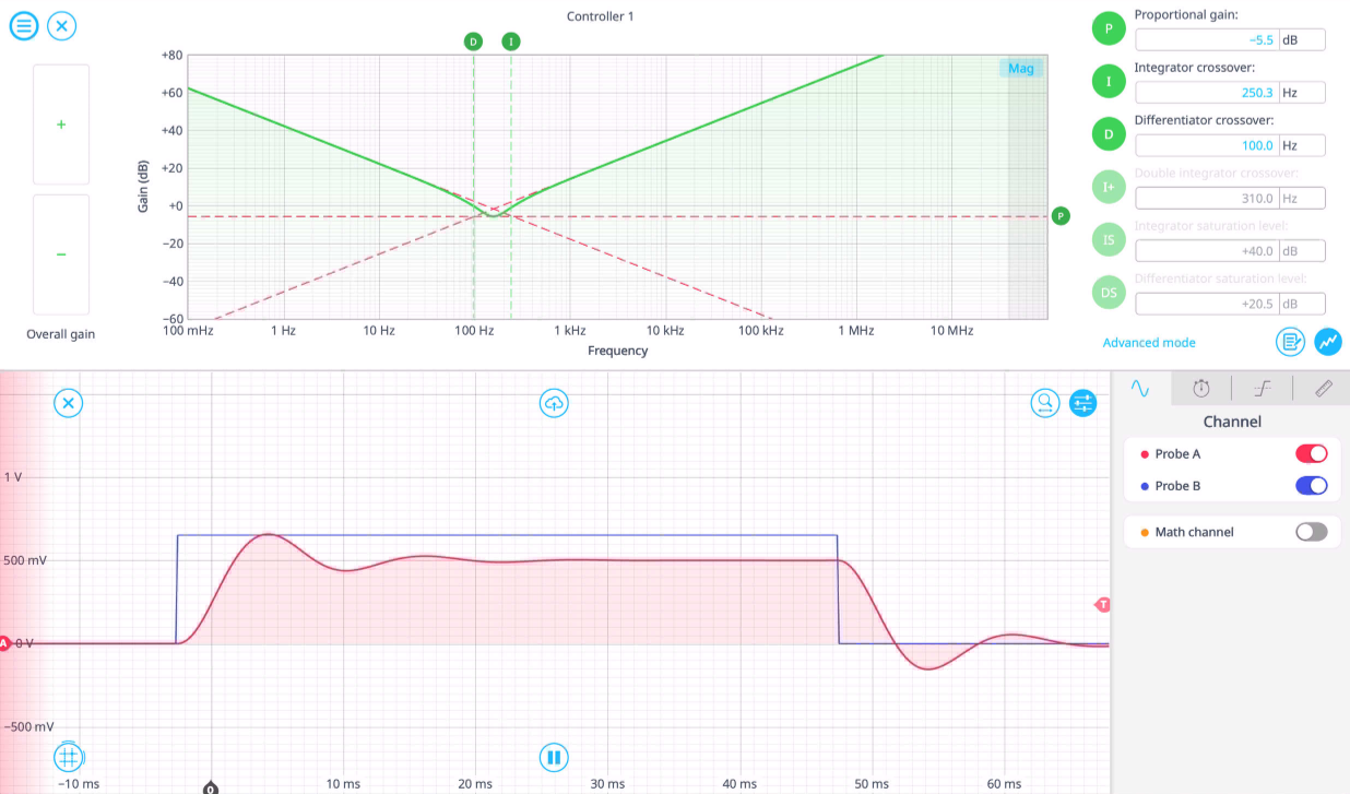 When tuning a digital PID controller, you can adjust parameters interactively on a gain plot and observe the response in real time on an embedded oscilloscope. This makes experimentally tuning your controller much easier than in traditional feedback systems, and requires far less calculations from the user. For a detailed guide on frequency-domain control, read our application note.