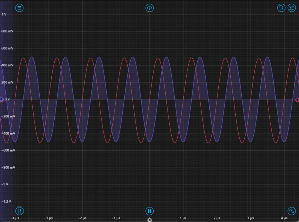 Opening the Waveform Generator, we create two sine waves with 50 MHz frequency and a relative phase of 90°. We synchronize the phase and move to the Oscilloscope to view the signals in the time domain. As can be seen in Figure 5, the signals are matched in amplitude with a phase offset between them.