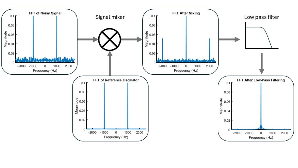 A solution to avoiding an increase in SNR from higher noise power at high frequencies, is to down convert the signal. Down conversion consists of mixing, or multiplying, your signal by an oscillator with the frequency of interest and then applying a low pass filter to filter out any unwanted high frequency components. Down conversion shifts the frequency band of interest. The Moku Lock-in Amplifier is a specialized down-converter that shifts the frequency band of interest, as shown in Figure 1. The Lock-in Amplifier lowpass filter constrains the noise bandwidth and, consequently, limits noise power to increase SNR, as visually noted on the Lock-in Amplifier output plot on the right side of Figure 1. This SNR improvement technique is useful for applications such as spectroscopy, materials characterization, and laser stabilization, where signals need to be extracted from noise. In this application note, we use a Moku:Pro Lock-in Amplifier with an extremely narrow low pass filter to measure signals with µV amplitudes.