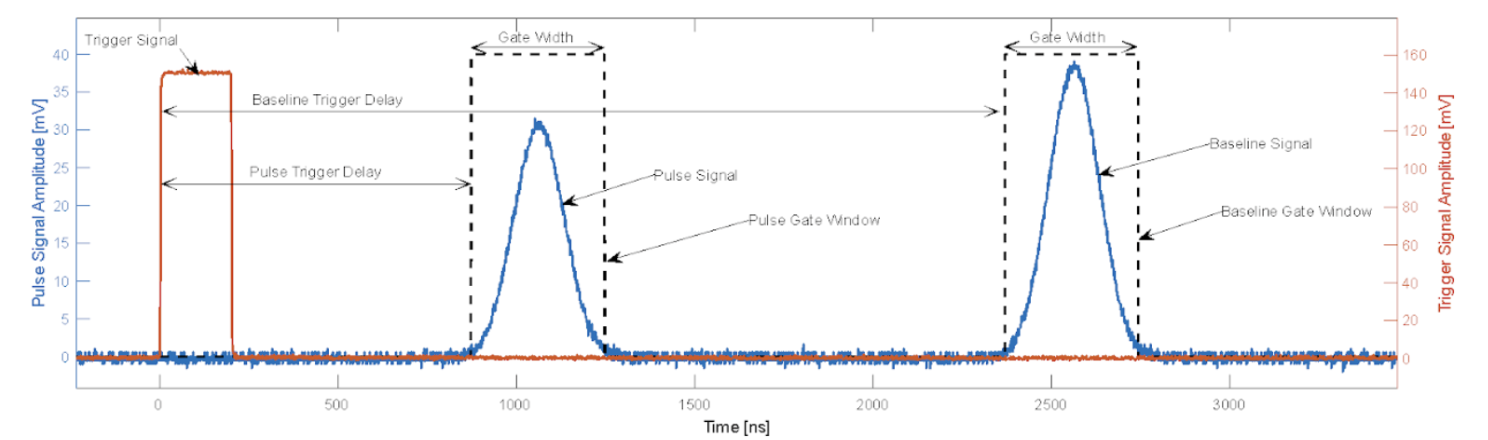 The trigger delays are set to ensure the boxcar windows align with the start of the pulses of interest. Once aligned, the gate width is adjusted to integrate most of the pulse duration, as shown in Figure 4. Both boxcar windows are configured to use the same gate width for consistency.