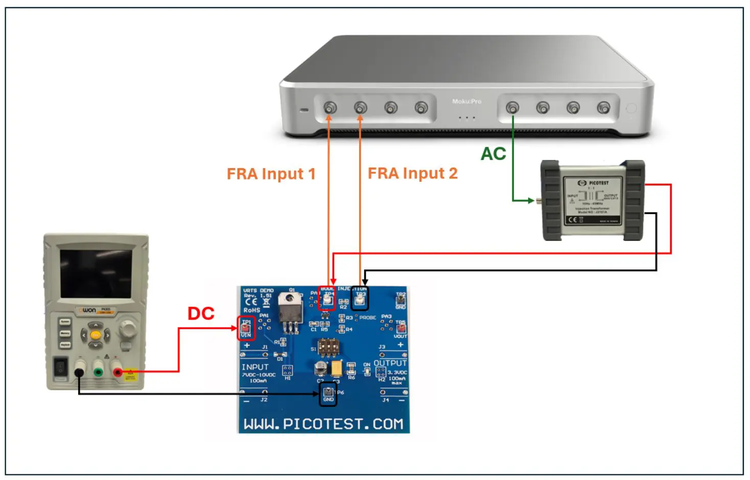 Non-invasive loop stability measurement of a voltage regulator using Moku:Pro