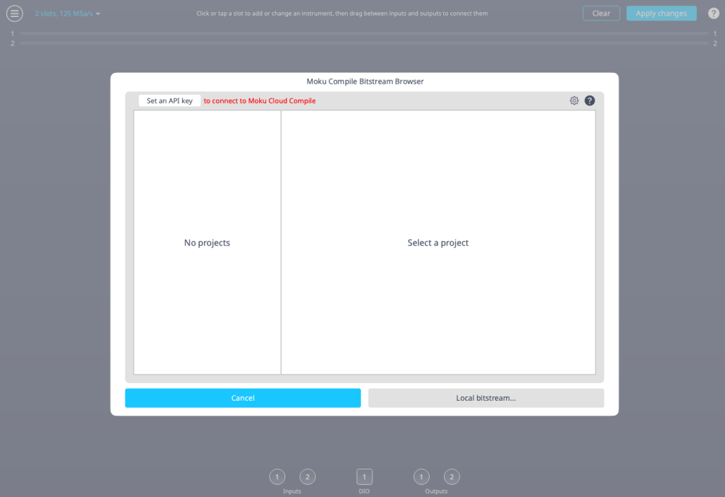Return to the Multi-Instrument Mode screen on your Moku device, and set the configuration as per Fig 16 in the previous section. Select Browse bitstreams, and then click Set an API key as seen in Fig 20. Copy and paste the key you obtained, then click Accept.