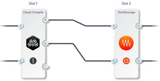 Figure 1: Test configuration for the AddSubtract_16 using Multi-Instrument Mode. In this setup, InputA and InputB of Moku Cloud Compile are internally routed from the outputs of the Moku Oscilloscope, while the processed output from Moku Cloud Compile is fed back into the Oscilloscope.