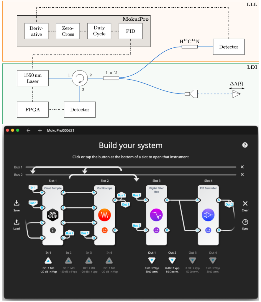 虽然 Moku Cloud Compile 和 Moku PID 控制器构成了实验反馈回路的骨干,但该团队还使用了 Moku 等调试工具 示波器以及 Moku 数字滤波器 用于预滤波信号。该团队的 多I仪器并行模式 配置如图1b所示。